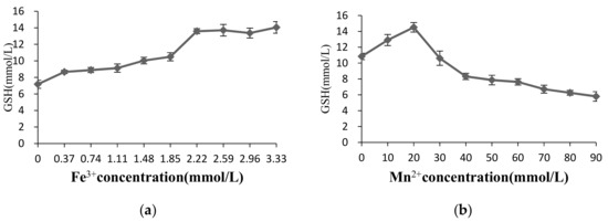 Many studies have shown that GSH-dependent reduction systems play an important role in resisting oxygen stresses for E. coli and Saccharomyces cerevisiae [37]. The active sulfhydryl group of GSH is oxidized by ROS to form oxidized glutathione, which can then be reduced to GSH under the action of glutathione reductase, thus removing the ROS and protecting the cell [38]. Under the induction of low concentrations of H2O2, it has been demonstrated that the proteins responsible for transcription regulation in yeast induce the transcription of genes in the GSH synthase line, thus producing more GSH to resist oxidative stresses [39]. The specificity of the glutathione redox transformation provides us with a new idea to improve the yield of GSH. Yeast cells were treated with different conditions of oxidative stress to observe if glutathione synthesis was promoted. Different concentrations of Mn2+/H2O2/Fe3+ (MnCl2/H2O2/FeCl3·6H2O) were added as stress agents to the reaction system to form an oxidative stress environment. A control group was assigned for each experiment. As seen from Figure 4a–e, compared with the control group, the oxidative conditions at different low concentrations all promoted the synthesis of glutathione. In addition, when each stressor was added alone, we found that the optimal concentrations were 20 mmol/L for Mn2+, 20 μL/100 mL for H2O2, and 2.22 mmol/L for Fe3+. When 20 mmol/L Mn2+ was combined with different concentrations of H2O2 and Fe3+, the optimal concentrations were 20 mmol/L of Mn2+, 10 μL/100 mL of H2O2, and 1.48 mmol/L of Fe3+. Glutathione can alternate between its oxidized and reduced states, so it can effectively maintain the intracellular redox balance [4]. When stimulated by oxidative stresses, yeast cells will synthesize more GSH to protect themselves and resist the adverse environments [40]. Stress agents may also affect the structure of glutathione synthetase [41]. When the enzyme structure changes, the enzymatic activity of glutathione synthetase is fully stimulated to catalyze GSH synthesis.