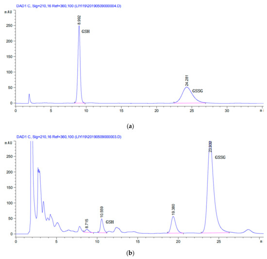Glutathione was analyzed using an Agilent 1200 high-performance liquid chromatograph. The column was Intersil ODS-3 C18, 250 mm × 4.6 mm, 5 μm. The mobile phase had a ratio of A:B of 90:10 (v:v). Phase A was a sodium heptanesulfonate-phosphate buffer solution, where 3.4 g potassium dihydrogen phosphate and 1.1 g sodium heptane sulfonate were dissolved in 500 mL water. The pH of the solution was adjusted to 3.0 with phosphoric acid. Phase B was methanol. A 0.45 μm microporous membrane was used to filter the phase A and phase B. The detection wavelength was 210 nm, the flow rate was 1.0 mL/min, and the injection volume was 20 μL [44,45].