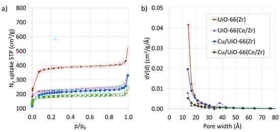 Textural properties of UiO-66 and Cu/UiO-66 materials were determined using the N2 sorption experiments. Figure 1 and Table 1 present the N2 adsorption–desorption isotherms, pore size distribution, and textural parameters of the obtained UiO-66 and Cu-UiO-66 materials. The courses of N2 uptake vs. P/P0 (Figure 1a) indicate type I isotherms which is characteristic for microporous materials. As is shown in Figure 1b, the majority of pores in obtained materials are smaller than 20 Å. From Table 1 it can be seen that the mean pore width ranges from 23.1 to 23.8 Å. The surface area (SBET) of UiO-66(Zr) is 1380 m2/g, which is higher than that reported in [20,21,22,23] and similar to [19]. The decrease in SBET to 810 m2/g is observed when part of Zr cations is replaced with cerium. Further SBET decrease occurs after UiO-66 impregnation with copper nitrate. The decrease in SBET of Zr-UiO-66, Hf-UiO-66, Zr-UiO-66-NH2, and Zr-UiO-66-COOH after impregnation with Cu(OAc)2 was also reported [7,19].