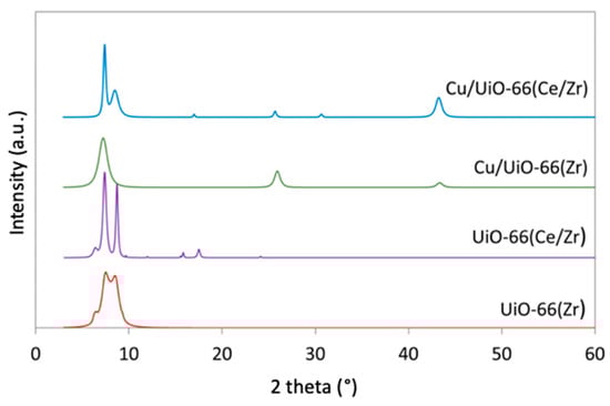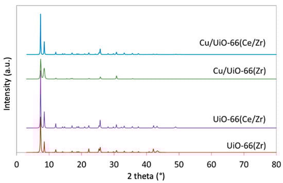 The crystallographic structures of obtained materials were determined by powder X-ray diffraction (XRD). The XRD patterns of UiO-66 and Cu/UiO-66 materials are presented in Figure 2. It can be observed that all of synthesized materials are crystalline and show sharp reflexes at 2θ of ca. 7.38, 8.52, 12.06, 14.15, and 14.78°, that correspond to reflections for the (111), (200), (220), (311), and (222) planes, respectively. Those reflexes are typical for the UiO-66(Zr) structure [29]. A 1° shift towards lower 2θ is observed for the bimetallic UiO-66(Ce/Zr) which is due to partial replacement of smaller-radii Zr4+ (0.84 Å) with a bigger-radii Ce4+ (0.97 Å) [30]. The crystallites sizes calculated from Scherrer equation for the [111] plane were: 31.99 nm for UiO-66(Zr), 52.74 nm for UiO-66(Ce/Zr), 35.17 nm for Cu/UiO-66(Zr), and 63.30 nm for Cu/UiO-66(Ce/Zr). Hence, the Ce introduction to the framework caused the increase of crystallites size. HIt is important to note that the crystallinity of the UiO-66(Zr) and UiO-66(Ce/Zr) (Figure 2) was retained after impregnation with copper nitrate. No reflexes coming from Cu phase (Cu, Cu2O, or CuO) are observed for Cu/UiO-66(Zr) and Cu/UiO-66(Ce/Zr), which can be due to relatively low Cu loading and its good dispersion over the framework.