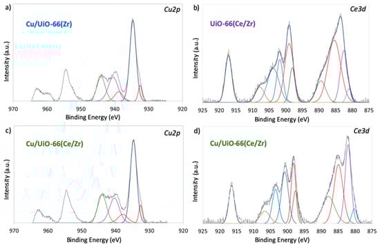 Cu2p and Ce3d X-ray photoelectron spectroscopy (XPS) spectra for Cu/UiO-66(Zr) (a), UiO-66(Ce/Zr) (b), and Cu/UiO-66(Ce/Zr) (c,d).