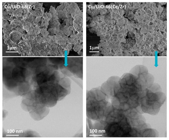 Scanning electron microscope (SEM) (up) and STEM (down) images of Cu/UiO-66(Zr) (left) and Cu/UiO-66(Ce/Zr) (right).