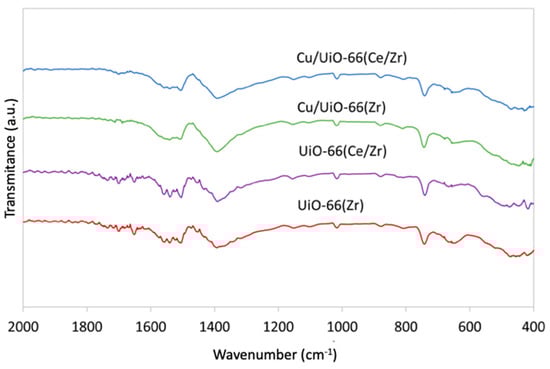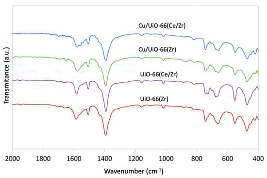 The Fourier transform infrared spectroscopy (FT-IR) was used for observations of the surfaces of the obtained UiO-66 and Cu/UiO-66 materials. The FT-IR spectra (Figure 7) of all samples display bands at the same wavenumber. The presence of vibration mode at 664 and 473 cm−1 is due to μ3-O and μ3-OH stretching vibrations of the Zr6O4(OH)4(CO2)12 in the UiO-66 framework. Whereas the band at 551 cm−1 is ascribed to Zr-(OC) asymmetric stretching vibrations. The small band visible at 1507 cm−1 in all samples can be associated with the vibration of the C=C in benzene ring in the deprotonated, and thus coordinated, BDC linker. Bands indicating the occurrence of asymmetric and symmetric ν(OCO) stretchings in the linker are visible at 1578 and 1390 cm−1, respectively. At low frequencies the modes due to OH and CH bending in H2BDC are mixed with Zr-O modes. Bands at ca. 812, 743, and 714 cm−1 correspond to the mix of C–H vibration, C=C stretch, OH bend, and OCO bend in terephthalic acid [33]. The presence of the latter, together with the bands at 1507, 1017 cm−1, can be due to BDC coordination with Zr [34] or Ce nodes. Whereas the presence of free –COOH groups in partially uncoordinated linker is proven by the occurrence of the band at 1673 cm−1. However, that band is not present on the spectra, which implies that obtained in this work UiO-66-based structures are terminated on the surface with Zr and/or Ce clusters. The existence of residual dimethylformamide (DMF) within the pores of obtained UiO-66 and Cu/UiO-66 is normally displayed by the band at 1658 cm−1 coming from the C=O asymmetric stretching vibrations. That band is hardly observable on the FT-IR spectra of obtained materials, which indicates successful exchange of solvent after the synthesis of UiO-66(Zr) and UiO-66(Ce/Zr).