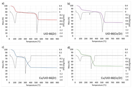 TG (—) and DTG (…) for UiO-66 and Cu/UiO-66 materials, a) UiO-66(Zr), b) UiO-66(Ce/Zr), c) Cu/UiO-66(Zr), d) Cu/UiO-66(Ce/Zr).