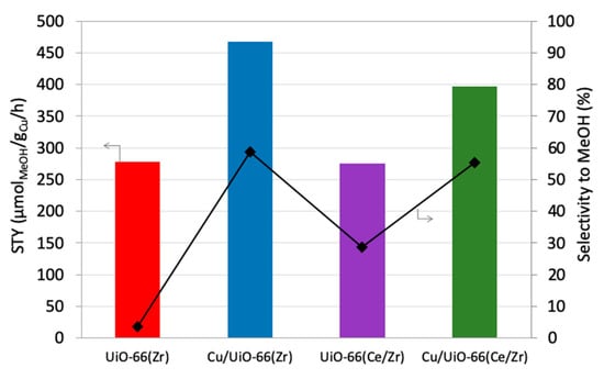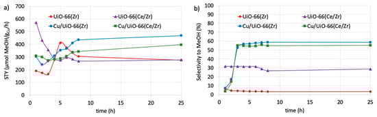 According to [18], the adsorption and activation of CO2 and H2 takes place on the unsaturated Zr and Cu sites, respectively. But in our conditions the CO2 activation occurs on the Zr and Ce (if applicable) sites. The poorest selectivity to MeOH, of only 3.5%, was noticed for UiO-66(Zr), but the introduction of cerium to the framework caused significant improvement in that field—selectivity increased to 28.7%. However, the introduction of Ce to the UiO-66 does not influence the rate of MeOH synthesis, which was found to be 278 µmolMeOH/gCu/h for UiO-66(Zr) and 275 µmolMeOH/gCu/h for UiO-66(Ce/Zr). The best performance in catalytic CO2 hydrogenation showed the Cu-loaded materials. The methanol STY after 25 h of test run was 468 µmolMeOH/gCu/h for Cu/UiO-66(Ce/Zr) and 397 µmolMeOH/gCu/h for Cu/UiO-66(Ce/Zr), whereas the selectivity to MeOH reached 59 and 56%, respectively (Figure 10). Our results are much better than those reported by Kobayashi et al. [19] who obtained 67.8 and 114.2 µmolMeOH/gCu/h over UiO-66(Zr) and Cu/UiO-66(Zr), respectively—over 4 times less than for corresponding catalysts discussed in this work. Nevertheless, obtained in their work Cu/UiO-66(Zr) revealed over 90% selectivity to MeOH, which is much better than that compared to our work. It must be also mentioned here, that they performed the catalytic test at higher T and lower pressure than we did (T = 220 °C, p = 2 Atm., H2/CO2 of 5:1). Those condition could have an impact on the catalysts performance since the reaction favours lower temperature and higher pressure.