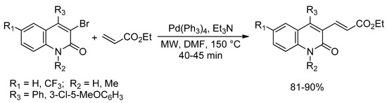 Heck reaction was developed in several approaches including synthesis of natural products, heterocycles and bioactive molecules. Selection of biologically active 4-aryl-3-alkenyl-substituted quinolin-2(1H)-ones have been synthesized in Heck reaction using commercially available intermediates. The vinylation of 3-bromoquinolin-2(1H)-one derivatives with ethyl acrylate was investigated under microwave irradiation. The optimal reaction conditions were accomplished using 3 mol% of tetrakis(triphenylphosphine) palladium(0) and 3 equiv. of triethylamine as base in DMF (Scheme 6). Full conversions to products were achieved in high yields within 40–45 min, in less than 5% of debrominated quinolinones being produced as byproducts [22].