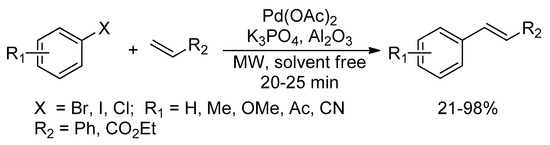 A simple modification to the classical Heck reaction under microwave irradiation afforded valuable conversions of aryl halides with terminal olefins using 0.05 mol% of palladium acetate (Pd(OAc)2). The reaction mixture was adsorbed on neutral alumina and irradiated at 300 W for 20–25 min under solvent- and ligand-free conditions, Scheme 7. Both aryl bromides and iodides were converted into high yields, whereas the efficiency of aryl chlorides was found to be very low even after applying a double amount of the catalyst. Moreover, electron-deficient aryl halides were more reactive than the electron-rich ones [23].