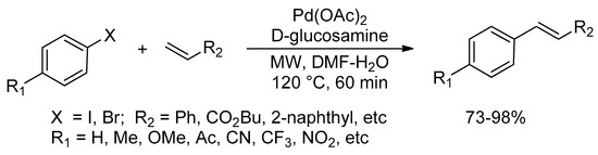 Recently, there has been a significant amount of research on the use of natural-based materials such as cyclodextrins [25], cellulose [26] and cucurbit [7] uril [27], to support Pd nanoparticles, for their unique and potentially useful features. The Pd-loaded materials showed good conversion activity in Heck cross-coupling reactions under irradiation condition. Furthermore, monosaccharides are widely available biomolecules and attempt to develop greener and economical chemical reactions. Monosaccharides are used for its several advantages, such as the cost-effectiveness, for the coordination with metals, and as a reducing agent for the stabilization of the catalytically active nanoparticles [28]. Jain’s group has studied the potential for the addition of D-glucosamine to Heck coupling reactions, exploring the possibility of replacing organophosphines. After optimization of the reaction conditions, the feasibility was assessed for a selection of aryl and heteroaryl iodides and bromides with styrene. Therefore, substituted trans-stilbenes and heteroaryl olefins were obtained in the presence of 0.1 mol% of Pd(OAc)2, D-glucosamine (1 equiv.), and K2(CO3)2 (3 equiv.) in aqueous DMF under microwave heating for 60 min. As usual, the yields resulting from conversion of aryl iodides are higher than aryl bromides. Aryl bearing at 4-position electron-withdrawing groups is found to be more reactive compared with electron-donating functions, Scheme 9 [29].