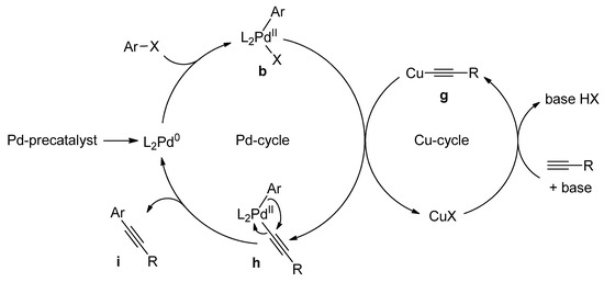 Sonogashira cross-coupling reaction has been developed in 1975 and since then proves to be as one of the very useful reaction implemented successfully in a wide variety of research active areas, including drug discovery and development, in the synthesis of heterocycles and natural products [32]. This reaction involves the coupling between an sp2 carbon of an aryl or vinyl halide (or pseudohalide) with a terminal sp hybridized carbon from an alkyne. Although, the reaction mechanism is fairly well established in the literature, it consists of two catalytic cycles and researchers mainly revolve around a palladium cycle. It is proposed that the reaction typically goes through zerovalent palladium species as an active catalyst. In the oxidative addition step, the insertion of palladium(0) into aryl halide bond delivers the palladium(II) complex (b). A side cycle supported by copper as a co-catalyst (CuX) develops the σ-alkynylcopper(I) organometallic reagent (g) for transmetalation step with complex b. The σ-alkynylpalladium(II) intermediate (h) is yielded afterward along with the active Cu species, which involves with alkyne substrate and base in second reaction sequence (Cu-cycle). Reductive elimination takes place eventually to afford the coupling product (i) and to regenerate the active Pd(0) catalyst, Scheme 11 [33,34].