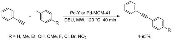 Under solvent-free microwave irradiation conditions, Sonogashira reaction was described using palladium modified mesoporous materials and zeolites, such as Pd-MCM-41, Pd-Y, Pd-VSB-5, and Pd-SBA-15. For instance, various phenyl iodides, bearing bromo or chloro functionality, were coupled with phenylacetylene using Pd-MCM-41 or Pd-Y in the presence of DBU as a base at 120 °C in 40 min (Scheme 15) [41].