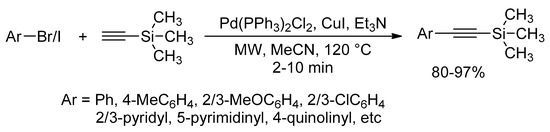 A method for the synthesis of 1-aryl-2-(trimethylsilyl)acetylene was recently developed using copper and palladium-catalyzed coupling of trimethylsilylacetylene and aryl bromides or iodides. Under microwave irradiation in acetonitrile and in the presence of triethylamine as a base. The desired products, bearing numerous functional groups, were obtained in good to excellent yields within 2–10 min. Aryl halides substituted on position-2 were coupled in slightly lesser yields, whereas, good results were achieved for heterocyclic aryl halides or naphthalene halides under same reaction conditions (Scheme 17) [43].
