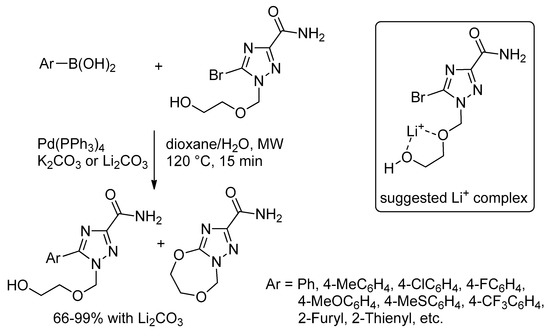 Zhu et al. have introduced aromatic group onto the bromotriazole acyclonucleoside derivative via Suzuki coupling reaction. The 5-aryltriazole acyclonucleosides featuring numerous aromatic groups on the triazole ring were synthesized using tetrakis(triphenylphosphine)palladium(0) in aqueous solution under microwave irradiation. Remarkably, the type of the used base significantly affects the reaction. Good to excellent yields were achieved when K2CO3 is employed and the coupling products were formed but in favor of intra-molecular cyclization of 5-bromo triazole derivatives. However, almost a quantitative yields of the coupling products were achieved when Li2CO3 is utilized, suppressing the cyclization of the starting material completely. The base behavior was justified to the formation of a Li+-complex with the side chain of 5-bromotriazole derivative, prohibiting the cyclization and consolidating the Suzuki coupling reactions, Scheme 21 [55].