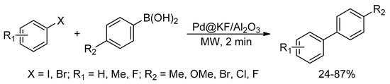 The use of recyclable solid catalyst under microwave irradiation condition offers a series of advantages, including the direct recovery of both product and catalyst. Hence, homogeneous palladium catalysts or nanoparticles were doped, impregnated [58], or immobilized [59] on various supports to address the issues of separation. Solventless microwave-assisted Suzuki reaction of aryl halides and boronic acids on palladium-doped KF/Al2O3 was first reported by Kabalka et al. [60]. The reaction performance was found to be insensitive to the substituents on the boronic acid and most efficient when aryl iodides are utilized (Scheme 24). Vinyl boronic acid or allylic halide were transformed smoothly to the cross-coupled products, whereas no reactions were observed when alkylboronic acid, vinyl halide, or alkyl halide were involved as reactants [61]. Although this transformation represented as a satisfactory work, the authors did not mention details on yield and Pd leaching after subsequent reuse of the doped catalyst. This protocol encountering two main limitations, the first one is that the cross-coupling does not proceed with aryl chloride, and the second limitation is that the KF/Al2O3 sample needs to be exposed to ambient air for at least two weeks prior to use and in order to obtain good yields. This could be rationalized that the presence of high level of moisture accelerates the cross-coupling reactions.