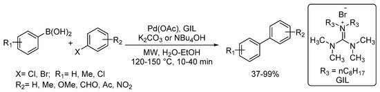 In many cases, the use of ionic liquids as an alternative to conventional polar solvents is advantageous in term of shorter reaction time, complete conversion of staring materials, facile product separation, and high yields [65]. A number of guanidinium ionic liquids (GILs) have been reported to exhibit high catalytic activities and more stabilities of ligand-free metal catalyst under aqueous conditions. A catalyst system generated in situ from Pd(OAc)2, base (K2CO3 or NBu4OH) and GIL in aqueous ethanol was reported to synthesize biaryls in moderate to excellent yields via Suzuki cross-coupling of aryl halides with aryl phenylboronic acid under focused microwave irradiating for 10–40 min in an inert atmosphere (Scheme 26). During the reaction, well-dispersed Pd(0) species is generated in nano-scale and stabilized by guanidinium salt affording Pd micelle/GIL, which is responsible for enhancing the activity. Notably, GILs bearing long alkyl chains have demonstrated superior performance in the catalytic reaction than those with short alkyl substituents [66].