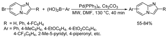 - Lee, J.-H.; Park, S.Y.; Park, A.; Yum, E.K. Diversification of Imidazo[1,2-a]pyridines under Microwave–Assisted Palladium-Catalyzed Suzuki Reaction. J. Korean Chem. Soc. 2017, 61, 299–303. [Google Scholar] [CrossRef]