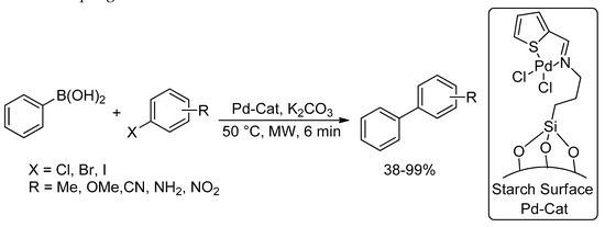 - Bai, L.; Wang, J.-X. Reusable, Polymer-Supported, Palladium-Catalyzed, Atom-Efficient Coupling Reaction of Aryl Halides with Sodium Tetraphenylborate in Water by Focused Microwave Irradiation. Adv. Synth. Catal. 2008, 350, 315–320. [Google Scholar] [CrossRef]
