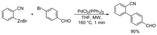 - Walla, P.; Kappe, C.O. Microwave-assisted Negishi and Kumada cross-coupling reactions of aryl chlorides. Chem. Commun. 2004, 564–565. [Google Scholar] [CrossRef]