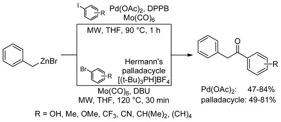 - Motwani, H.V.; Larhed, M. Diarylated Ethanones from Mo(CO)6-Mediated and Microwave-Assisted Palladium-Catalysed Carbonylative Negishi Cross-Couplings. Eur. J. Org. Chem. 2013, 4729–4733. [Google Scholar] [CrossRef]
