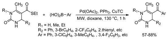 - Lengar, A.; Kappe, C.O. Tunable Carbon−Carbon and Carbon−Sulfur Cross-Coupling of Boronic Acids with 3,4-Dihydropyrimidine-2-thiones. Org. Lett. 2004, 6, 771–774. [Google Scholar] [CrossRef] [PubMed]