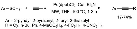 - Mehta, V.P.; Sharma, A.; Van der Eycken, E. The First Palladium-Catalyzed Desulfitative Sonogashira-Type Cross-Coupling of (Hetero)aryl Thioethers with Terminal Alkynes. Org. Lett. 2008, 10, 1147–1150. [Google Scholar] [CrossRef]
