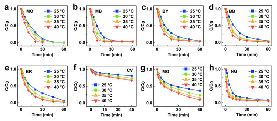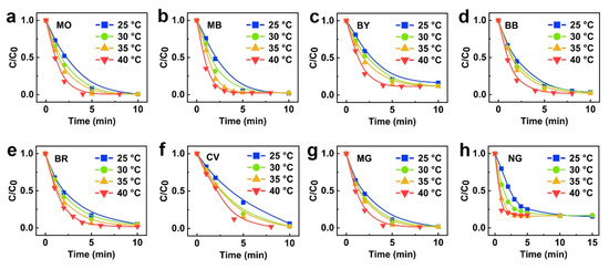 Figure 2a–h show the degradation performance of Fe78Si9B13 metallic glass ribbons on the eight different dyes from 25 to 40 °C. It can be seen that almost all the dye decolorizations reach completion within 10 min at 25 °C, showing the outstanding catalytic performance of Fe78Si9B13 metallic glass ribbons in the Fenton-like process due to their fast electron transfer ability and relatively strong surface stability, which have been intrinsically investigated in recent years [6,9]. However, two dyes (BY and NG) present exceptional decolorization performance, where BY reaches a 90% decolorization and the NG decolorization rate is about 80% within 10 min at the same temperature (25 °C). In addition, compared to our previous work [50], the NG decolorization rate in the Fenton-like process in this work is slightly lower than that in the photo-enhanced sulfate radical-based AOPs (about 95%) in previous work using the same Fe78Si9B13 metallic glass ribbons. The higher decolorization rate of NG in the photo-enhanced sulfate radical-based AOPs may be attributed to the effect of the external UV-Vis irradiation effect and the different AOPs system used. Both BY and NG show negligible enhancement effect upon full completion of dye decolorization although the reaction rate is enhanced at high temperatures. This enhanced reaction rate has also been observed in the other six dyes (MO, MB, BB, BR, CV and MG) when the reaction temperature is increased. In fact, the temperature also has a similar effect as UV-Vis irradiation, which facilitates completion of faster reactions due to the supplementary activation by the external energy [33].