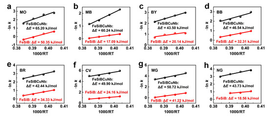 Activation energy ΔE of Fe78Si9B13 (FeSiB) and Fe73.5Si13.5B9Cu1Nb3 (FeSiBCuNb) metallic glass ribbons for (a) MO, (b) MB, (c) BY, (d) BB, (e) BR, (f) CV, (g) MG and (h) NG dyes.