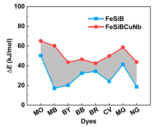 A summary of the activation energy ΔE values of Fe78Si9B13 (FeSiB) and Fe73.5Si13.5B9Cu1Nb3 (FeSiBCuNb) metallic glass ribbons for MO, MB, BY, BB, BR, CV, MG and NG dyes. Arrhenius curve fitting is based on reaction temperatures ranging from 25–40 °C.