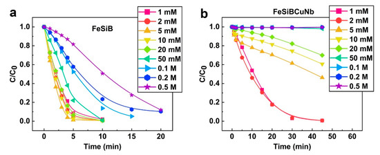 In this work, MO was selected for the investigation of the H2O2 effect by Fe78Si9B13 and Fe73.5Si13.5B9Cu1Nb3 metallic glass ribbons (Figure 6). As shown in Figure 6a, Fe78Si9B13 and a wide range of H2O2 concentrations from 1 mM to 0.5 M have been applied as the main Fenton reagents. When the H2O2 concentration increases from 1 mM to 5 mM, an apparent increase of catalytic efficiency results in full decolorization within 5 min. Consistent with many previous reports however, a further increase of H2O2 concentration (>5 mM) has an inhibitory effect on the catalytic efficiency due to scavenging effect of H2O2 on the •OH radicals produced, which leads to a declined catalytic activity [31]. Within the range of 1 mM to 50 mM, the decolorization of MO still reaches almost completion within 10 min. The decay of catalytic efficiency has been further enhanced using a H2O2 concentration of 0.5 M but the decolorization can reach more than 80% in 20 min. In comparison, the variation of H2O2 shows a stronger inhibitory effect on the catalytic efficiency using Fe73.5Si13.5B9Cu1Nb3 as a catalyst and the range of feasible concentrations is very limited (Figure 6b). Only 1 and 2 mM H2O2 present optimized efficiency for the full MO decolorization in 45 min. From 5 mM to 20 mM, the inhibitory effect of H2O2 on decolorization is apparent. Further increasing the H2O2 concentration from 50 mM to 0.5 M results in negligible MO decolorization within 45 min. In both ribbons, a high H2O2 concentration has a detrimental effect on catalytic efficiency.