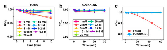 It should be noticed that Fenton-like processes usually rely on acidic conditions to maintain a reliable catalytic performance. pH 3.0 is typically used for most iron-containing catalysts, including the Fe-based metallic glasses used in this work. Under weaker acidic conditions (e.g., pH 4.0), the catalytic efficiency will decline and it will be further inhibited under neutral conditions. Figure 8a,b show the catalytic performance of the two metallic glass ribbons used under neutral conditions (pH 6.2 ± 0.1) with different H2O2 concentrations. Both of them exhibit unapparent decolorization of MO dye, indicating that the neutral condition is unfavorable for Fenton-like processes using metallic glass ribbons [24]. At a high concentration of H2O2 (0.5 M), the catalytic efficiency is also very low, with 15% and 0% of decolorization rate for Fe78Si9B13 and Fe73.5Si13.5B9Cu1Nb3, respectively, after 60 min (Figure 8c). However, it has been reported that Fenton-like processes with UV-Vis irradiation can highly enhance their color removal rates under neutral conditions [33]. Accordingly, Figure 9a,b suggest that a low concentration of H2O2 (50 mM) with UV-Vis irradiation does not effectively promote the decolorization rate but the combination of high H2O2 concentration and UV-Vis irradiation effectively enhances the decolorization rate. At 1.0 M H2O2, both metallic glass ribbons do not exhibit a big difference in MO decolorization, which reaches up to 94% and 90% for Fe78Si9B13 and Fe73.5Si13.5B9Cu1Nb3, respectively, within 60 min. Increasing the H2O2 concentration under UV-Vis irradiation leading to promoted dye degradation rate reveals that the combination of high concentration of H2O2 and irradiation can overcome the catalytic efficiency limitation under neutral conditions.
