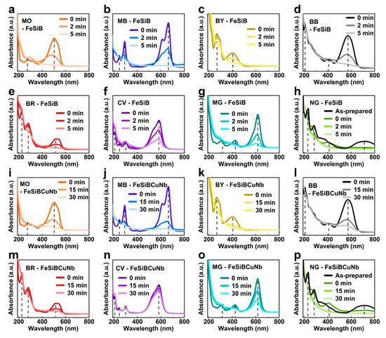 UV-Vis spectra of (a) MO, (b) MB, (c) BY, (d) BB, (e) BR (f) CV, (g) MG and (h) NG dye degradation by Fe78Si9B13 (FeSiB) within 5 min. UV-Vis spectra of (i) MO, (j) MB, (k) BY, (l) BB, (m) BR (n) CV, (o) MG and (p) NG dye degradation by Fe73.5Si13.5B9Cu1Nb3 (FeSiBCuNb) within 30 min. (dye concentration: 20 ppm, catalyst dosage: 0.5 g/L, H2O2 concentration: 1 mM, pH 3.0).