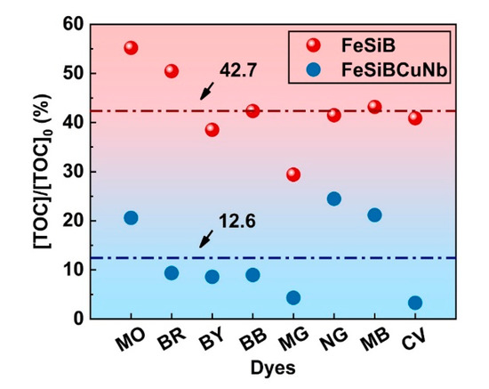 - Fe78Si9B13 metallic glass ribbons achieve an average TOC removal rate of 42.7% dye degradation in 15 min, which is higher than Fe73.5Si13.5B9Cu1Nb3 (12.6%). The decolorization rate is closely related to the mineralization rate.