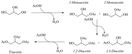 - Okoye, P.; Abdullah, A.; Hameed, B. A Review on Recent Developments and Progress in the Kinetics and Deactivation of Catalytic Acetylation of Glycerol—A Byproduct of Biodiesel. Renew. Sustain. Energy Rev. 2017, 74, 387–401. [Google Scholar] [CrossRef]