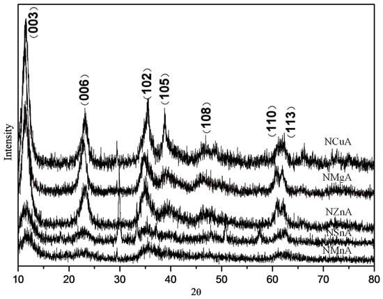 The X-ray diffraction (XRD) patterns of hydrotalcite-like precursors are shown in Figure 1. It can be seen that NMgA, NSnA, NZnA, and NCuA samples exhibited a similar structure. Due to the formation of SnO at 29.8, 33.2, 50.6, and 57.5°, several special peaks of NSnA hydrotalcite precursors were higher than those of other hydrotalcite precursors. The diffraction peaks appeared at 11.4 (003), 23.2 (006), 35.4 (102), 38.8 (105), 46.3 (108), 61.9 (110), and 62.1° (113) in the XRD patterns of NMgA, NSnA, NZnA, and NCuA hydrotalcite-like precursors, which demonstrated that these four samples had well-crystallite hydrotalcite structure and only traces of other crystallite phases existed in these compounds. However, for the Ni/Mn/Al precursor, no hydrotalcite crystalline peak was observed.