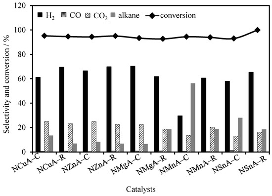 Based on the results of gas chromatograph (GC), it can be known that H2, CH4, CO, CO2, and C2H6 were the main gas products for the APR reaction. The selectivity of H2 ranged from 29.5% to 70.3%. The highest selectivity of H2 was obtained by NMgA–C. It can be deduced that adding magnesium to the Ni–Al hydrotalcite-derived catalysts could enhance the selectivity of H2. In addition, strong interaction was formed between Ni and Mg(Al)O, which is in favor of transforming electrons from the Mg(Al)O supporter into Ni species. Thus, the electronegativity of the active Ni species increased, and the dehydration probability of ethylene glycol was further decreased [41]. Then, the selectivity of H2 was improved in APR reaction. The lowest selectivity of H2 was obtained by the NMA–C catalyst, and only weak catalytic activity was shown during the APR reaction. As shown in Figure 5, NCuA–R/C and NZnA–R/C as catalysts, showed excellent catalytic performance; and the selectivity of H2 over these catalysts were higher than that when using NSnA–R/C and NMnA–R/C as catalysts.