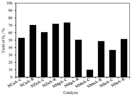 The APR reaction results over hydrotalcite-derived catalysts are as shown in Figure 5 and Figure 6. Through comparing the reaction results over hydrotalcite-derived catalysts before and after reduction, it was found that the selectivity and yield of H2 were higher when using reduced hydrotalcite-derived catalysts, except for in NMgA–C and NMgA–R. Meanwhile, as shown in Table 1, the conversions of ethylene glycol are generally higher than 90%.