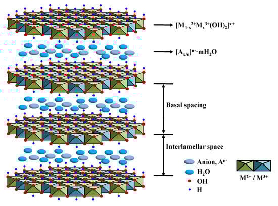 Structural representation of layered double hydroxides (LDH). Adapted from Ref. [], Copyright 2017, MDPI.