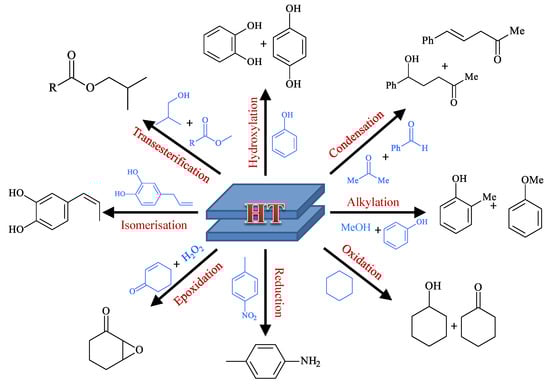 Their variable composition and their tunable intrinsic properties clarify the reason why catalytic usage belongs to their main field of applications. As solid base catalysts, LDHs exhibit high activities and selectivities for different types of reactions, mainly organic transformations (Figure 2), such as alkylation, isomerization, hydroxylation, transesterification, hydroformylation, redox reactions, condensation, and environmentally friendly reactions. Moreover, the mixed oxides that were obtained after calcination of the LDH usually have good catalytic activities and they have been applied to the following organic reactions: aldol and Knoevenagel condensations; epoxidation of olefins; halide exchanges; phenol hydroxylation; and, Michael additions [].