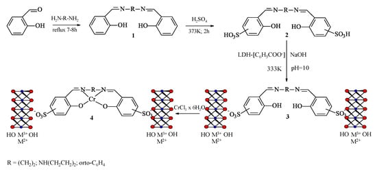 Wu et al. [] used a different strategy, which consists first in the incorporation of the anionic salen-like ligand in the interlamellar space and then forming the complex in situ by reaction with Cr3+ chloride in order to incorporate chromium complexes in the interlayer of a Mg-Al LDH [,], as can be seen in Figure 6.