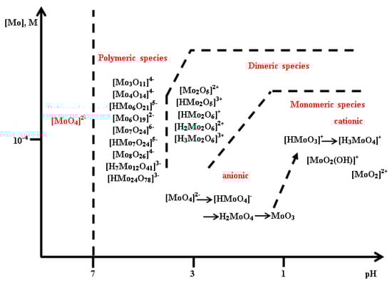 The intercalation of molybdenum-based anions in the structure of layered double hydroxides is a laborious process and it mostly depends on the pH and the Mo(VI) concentration. Moreover, the evolution of Mo(VI) in solutions is enriched, due to the existence of polymers that may lead to the obtaining of a variety of anions, the predominant ones being [MoO4]2−, [HMoO4]−, [Mo6O19]2−, [Mo7O24]6−, [HMo7O24]5−, [H2Mo7O24]4−, and [Mo8O26]2− []. The geometry of smaller anions, such as [MoO4]2−, is tetrahedral, while larger anions, like [Mo6O19]2− and [Mo7O24]6−, possess octahedral or distorted octahedral configuration. The intercalation of vanadates in the interlayer space of layered double hydroxides has been intensively studied, while that of molybdates has been restricted to the heptamolybdate [Mo7O24]6− ions that can be stabilized at a lower pH and can act as pillars that are used to expand the distance between the brucite-type sheets []. Additionally, Van Laar et al. [] discovered that the [MoO4]2− hydrolysis at a pH value of 10 inhibits the intercalation in the LDH structure and polymerization of molybdate does not occur until pH < 7 (Figure 8). The molybdate-containing LDH with slightly different chemical composition could be useful as selective catalysts for different processes. The first studies that were recorded for the characterization of oxomolybdate species at different acidic pH values were based on potentiometric titrations []. The main conclusion was that [MoO4]2− ions are stable at pH 6.5, while the heptamolybdate [Mo7O24]6− exists in equilibrium with [MoO4]2− at a pH between 4 and 6.5. Further acidification, 1.5 < pH < 2.9, enabled the obtaining of octamolybdate anion [Mo8O44]2−. Larger ionic aggregates are expected to appear at lower pH values, but there are no studies that are related to this statement []. Similar to the chromate- and vanadate-containing LDH, the reported methods that are used to prepare hydrotalcites with intercalated molybdenum-based anions containing different pairs of divalent/trivalent cations in the brucite-like layers are co-precipitation, anion exchange, and hydrothermal method. The studies showed that molybdenum can be introduced either as one of its anionic forms in the interlayer (Table 6) or as a cation in the brucite-type layers (Table 7).