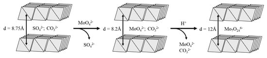 The most used method for molybdate incorporation in MgAl-LDH structure is the anionic exchange. However, Drezdon et al. [] reported a new technique derived from the classical ionic exchange that primarily involves the synthesis of an organic anion-pillared precursor, also called swelling agent, which is subsequently exchanged with an adequate polyoxometalate anion under acidic conditions []. In this case, the organic anion needs to have slightly larger dimensions than the polyoxometalate to be incorporated. By creating an acidic medium, the organic anion already incorporated in the LDH will be protonated, which weakens the electrostatic interaction between the cationic layers and the intercalated organic species and, thus, allowing for the partial exchange of the organically-pillared hydrotalcite with the polyoxometalate []. Moreover, the anion affinity in LDH interlayers depends on the size of the ion and its charge []. The monovalent anions have lower affinities and, hence, their participation in anion exchange reactions is favored when compared to divalent anions []. Based on the XRD results, Davantes et al. [] were able to create a representative scheme that describes the interlayer exchange of different anions (Figure 9). The affinity series decreases in the order [Mo7O24]6− > CO32− > [MoO4]2− > SO42− []. The diffraction patterns of the Mo-intercalated samples that were obtained by Carriazo et al. [] are characteristic to hydrotalcite-like structure, indicating a rhombohedral packing of the layers. The powder XRD patterns of layered double hydroxides usually present a decrease in the intensities of the (00l) lines, while the value of l increases, but, in this situation, it was observed that the intensity of the (006) and (009) lines are larger than that of the (003) line.