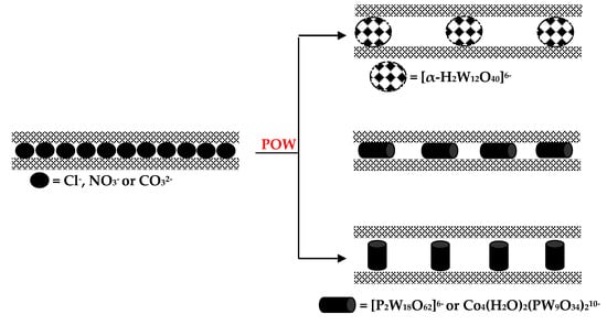 The POM/LDH materials have attracted wide interest in catalysis, as they have great advantages over other LDH-based compounds [] that are attributed to the synergistic effects between the hydrotalcite and the polyoxometalates. The LDH solids offer a remarkable opportunity to modify their functionality without compromising their structural features due to the relatively weak interlayer interactions []. The incorporation of catalytically active species, such as inorganic anions, ligands, or biomolecules into the interlayer space of LDHs, has been proven to enhance the catalytic stability and recyclability when compared to their homogeneous counterparts []. A series of intermolecular interactions, including electrostatic and hydrogen bonding, can be found between the brucite-like layers of LDHs and the intercalated POM anions []. Figure 4 illustrates the general structure of the POM-LDH composition. Although POM-intercalated LDH exhibits superior application capabilities when compared to individual components, the intercalation of POMs into LDH implies some serious complications. First of all, under the neutral to slightly acidic reaction conditions, there is the possibility that M2+/M3+ cations leach out during the anionic exchange reactions between LDH precursor and the POM anions []. Secondly, the M2+/M3+ ratio in the POM pillared LDH must be rigorously controlled, since it helps to determine the charge density of the LDH layers, affecting the basal spacing between the brucite-type layers [,]. It is mandatory to maintain, as much as possible, the desired M2+/M3+ ratio from the initial step of the preparation towards the final one in order to synthesize POM/LDH solids with different pore size distributions [].