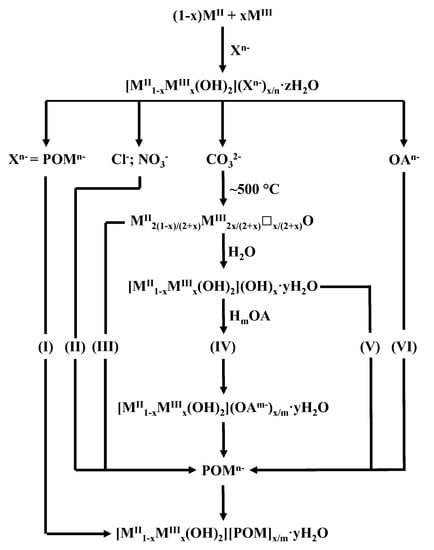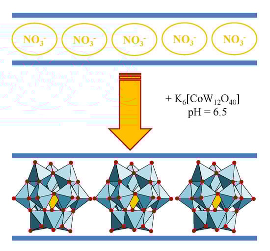Moreover, some POM anions were proven to be unstable at weakly acidic to basic pH [], explaining why the pillaring reactions are often accompanied by the co-formation of an impurity phase, consisting of the M2+ rich salt of the POM that deposits on the surface of the layered double hydroxide []. Its deposition can block the micropores of LDH, which leads to the obtaining of low surface areas []. It is difficult to prepare POM/LDH nanocomposites in a crystalline form, mostly because LDH hosts act like a base, while most polyoxometalates present acidic properties. Several synthesis methods can be used for the preparation of POM-LDH composites, the co-precipitation, the reconstruction, and the ionic exchange being among the most developed ones []. There are also some relatively new preparation techniques that still need improvements, such as electrochemical reduction, ultrasound treatment, and delamination technology [].
