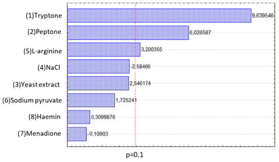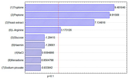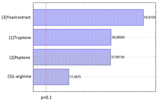 Cell concentration ranged from 0.04 to 0.98 g d.w. cells/L, while deviation of center point was inferior to 10%, indicating a good reproducibility. Analysis of variance (ANOVA) and the significance of the results were verified using Fisher’s statistical test (F-test) at 10% of significance. The Pareto diagram (Figure 2) shows tryptone, peptone, yeast extract, and l-arginine concentrations as the variables that influences cell growth, indicating a positive effect. Considering yeast extract is not only a vitamin source, but also a compound that contains carbon, nitrogen, and other elements, it is possible that it can replace other compounds for cell growth, as the results show.