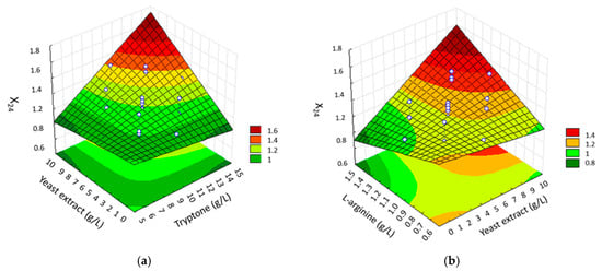 Table 4 shows that there was no lack of adjustment (p > 0.1) for the predicted model, which indicates that it is adequate to describe the process. Despite the non-significance of l-arginine, it was considered in the model as the linear interaction between this component and yeast extract was significant (Table 4). The first-order polynomial model proposed for cell growth including all the linear, quadratic, and linear interaction coefficients that were significant to this variable is presented in Equation (1).
