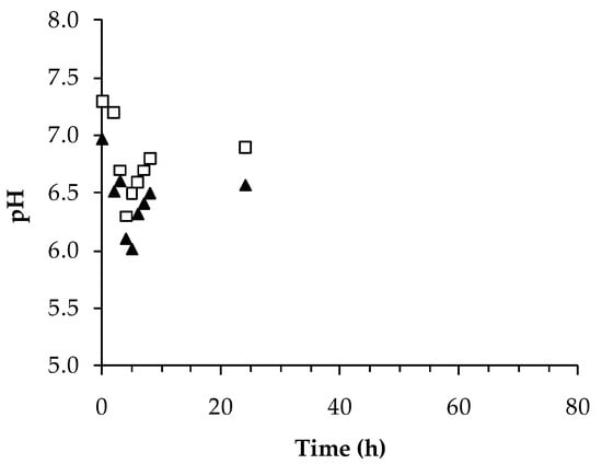 pH during syngas fermentation by C. carboxidivorans on Tryptone-Peptone-Yeast extract-Glucose-Arginine medium (TPYGarg) (▲) and ATCC® 2713 (□).