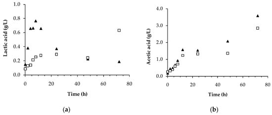 In the present study, with glucose and CO/CO2 as carbon sources, acid production starts immediately after seed culture inoculation and along with bacterial biomass increase, as Figure 7 depicts. Most abundant acids obtained were acetic and lactic acids and their concentrations still increase even after glucose depletion, suggesting that those acids can be produced from carbon sources other than glucose, as CO and CO2 from syngas, or from tryptone and peptone. Maximum concentrations of acetic acid were 3.57 g/L and 2.85 g/L after 72 h of fermentation on TPYGarg and ATCC® 2713 media, respectively. For lactic acid, 3-times more acid is produced after 8 h on TPYGarg in relation to ATCC® 2713, but at the end (70 h) a similar value is obtained on ATCC® 2713.