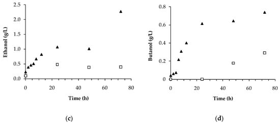 Maximum ethanol production on TPYGarg was 5.7-times higher than on ATCC® 2713 after 72 h of fermentation (Figure 7c). Ethanol productivity (considering 24 h) was also improved on TPYGarg (0.045 g/L·h) in comparison to ATCC ® 2713 (0.020 g/L·h). Fernández-Naveira et al. [] reported an inferior ethanol productivity (0.03 g/L·h) using the same microorganism and a medium containing 30 g/L of glucose, 1 g/L of yeast extract, minerals, trace metal, and vitamin solutions, with no syngas addition. This ethanol productivity was higher than those reported on syngas fermentation [,,], which might be related to medium composition. Regarding butanol production, TPYGarg performance was also better than ATCC® 2713, with a butanol production almost 2.5-times higher. For butanol productivity, Fernández-Naveira et al. [] reported 0.007 g/L·h, while 0.04 g/L·h was obtained in this study.