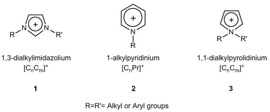 Ionic liquids (ILs) are defined as salts with melting point below the boiling point of water and they are widely recognized as green solvents in many organic reactions for their properties [12]. Generally, they consist of an organic cation and an inorganic anion, and their different combination has a high impact on polarity, hydrophilicity/hydrophobicity, and physical and chemical properties of the ionic liquid, including their melting points. Typically, the anions are inorganic and include [PF6]−, [BF4]−, [CF3SO3]−, and [(CF3SO2)2N]−, while the organic cationic portion is generally constituted from asymmetric ammonium or phopshonium salts or heterocycles, such as 1,3-dialkylimidazolium 1, 1-alkylpyridinium 2, and 1,1-dialkylpyrolidinium salts 3 (Figure 1) [13].