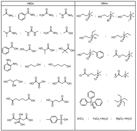 Deep eutectic solvents (DESs) are a new class of non-conventional solvents like ionic liquids. They are a eutectic mixture composed of Lewis or Brönsted acid (hydrogen bond donor commonly defined as HBDs) and bases in the form of salts (hydrogen bond acceptors commonly defined as HBAs), that can contain different types of anions and cations. In Figure 4, the most common hydrogen bond donors and hydrogen bonds acceptors are reported [49,50].