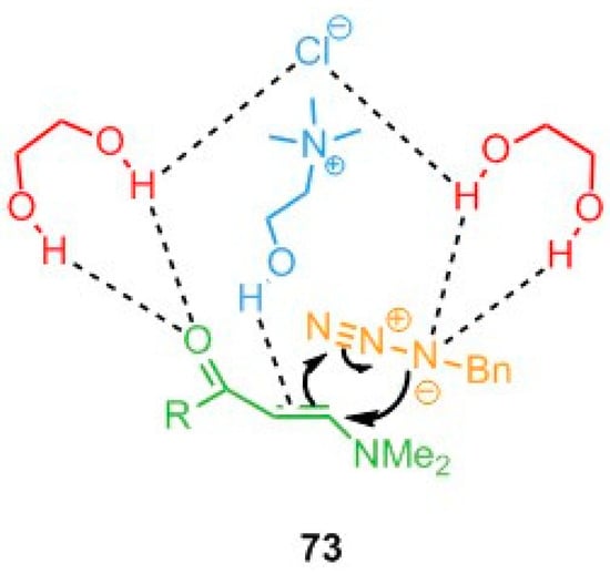 In 2016, Martins and co-workers developed a synthetic strategy to produce 1,4-disubtituted-1,2,3 triazoles 72 by 1,3-dipolar cycloaddition between azides 70 as 1,3-dipole and β-enaminones 71 as dipolarophile in a DES composed of choline chloride:ethylene glycol (1:2) (Scheme 13) [58].
